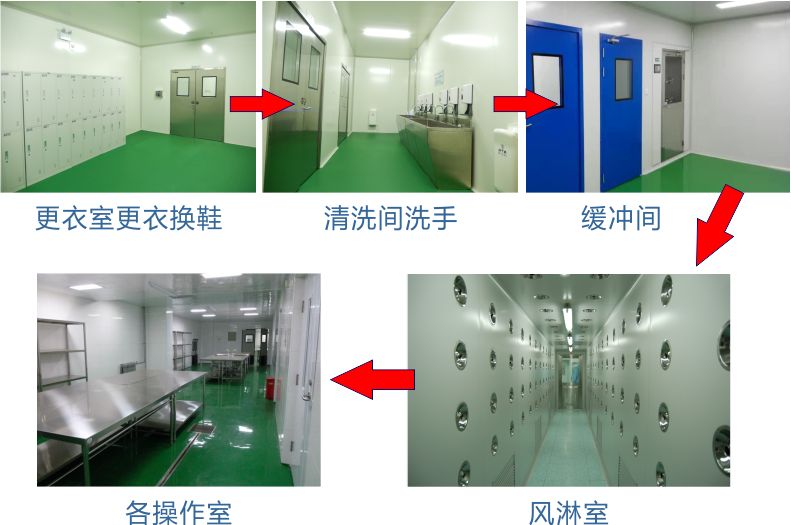 凡進(jìn)入100000級(jí)或300000級(jí)凈化車間潔凈區(qū)的人員,包括操作人員、機(jī)修人員、后勤人員均需經(jīng)過換鞋、穿潔凈服、并戴潔凈帽;凡進(jìn)入10000級(jí)潔凈區(qū)人員均需經(jīng)過換鞋、存衣、淋浴、更衣、穿無菌潔凈衣、消毒洗手、風(fēng)淋進(jìn)入GMP凈化潔凈區(qū)。